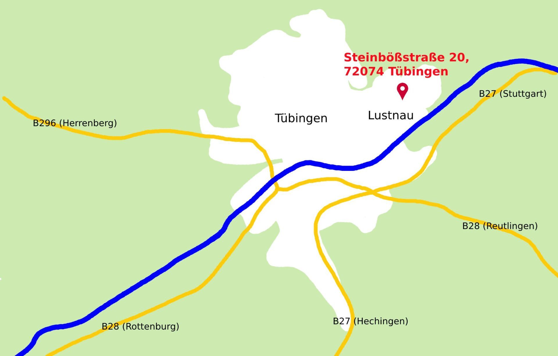 Meine Privatpraxis befindet sich im Zentrum von Tübingen-Lustnau, Steinbößstraße 20. Sie ist sowohl mit öffentlichen Verkehrsmitteln (Linie 1, Haltestelle Dorfackerschule) als auch mit dem PKW sehr gut erreichbar. Parkplätze sind in der Nähe ausreichend vorhanden. Die Praxis ist barrierearm zu erreichen.